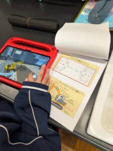 一つ目は、子供たちが実際の重機を動かす代わりに、タブレットを使ってバックホウ(油圧ショベル)を操作し、