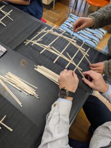 釘や接着剤を使わず、割りばしだけで橋を作るという、まさに”ひらめき”と”構造の不思議”を学ぶ時間です。